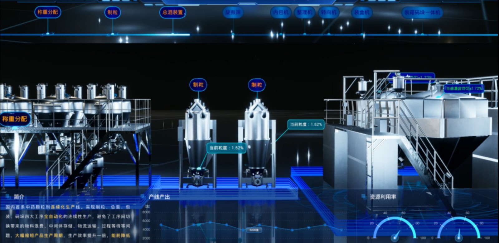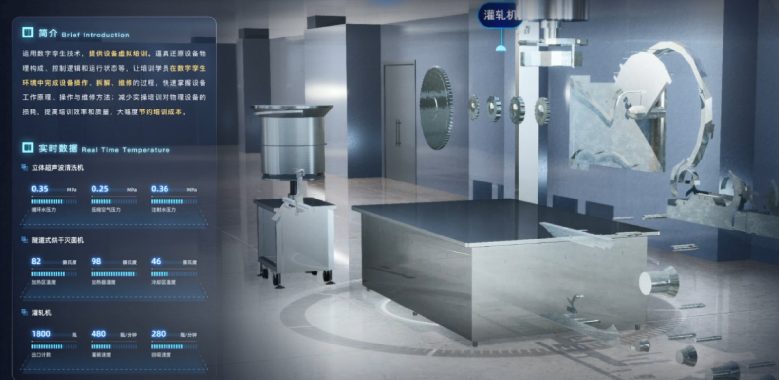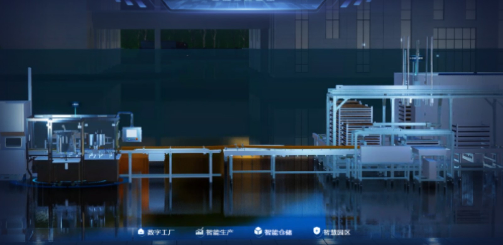 以数据驱动的方式实时再现口服液自动化生产线重要设备运行情况、产线运行情况、产线与车间生产运营情况,具备漫游巡检、故障诊断、远程运维等功能。可以将工厂各个环节的数据以可视化的形式展示,包括实时环境监测、设备实时监测、生产线状态、能源消耗、安防监控、应急响应等。将信息进行处理和分析后,通过大屏展示在用户面前,使用户能够实时模拟工厂运行情况,预测潜在问题,并进行虚拟实验和优化,从而提高生产效率和质量。